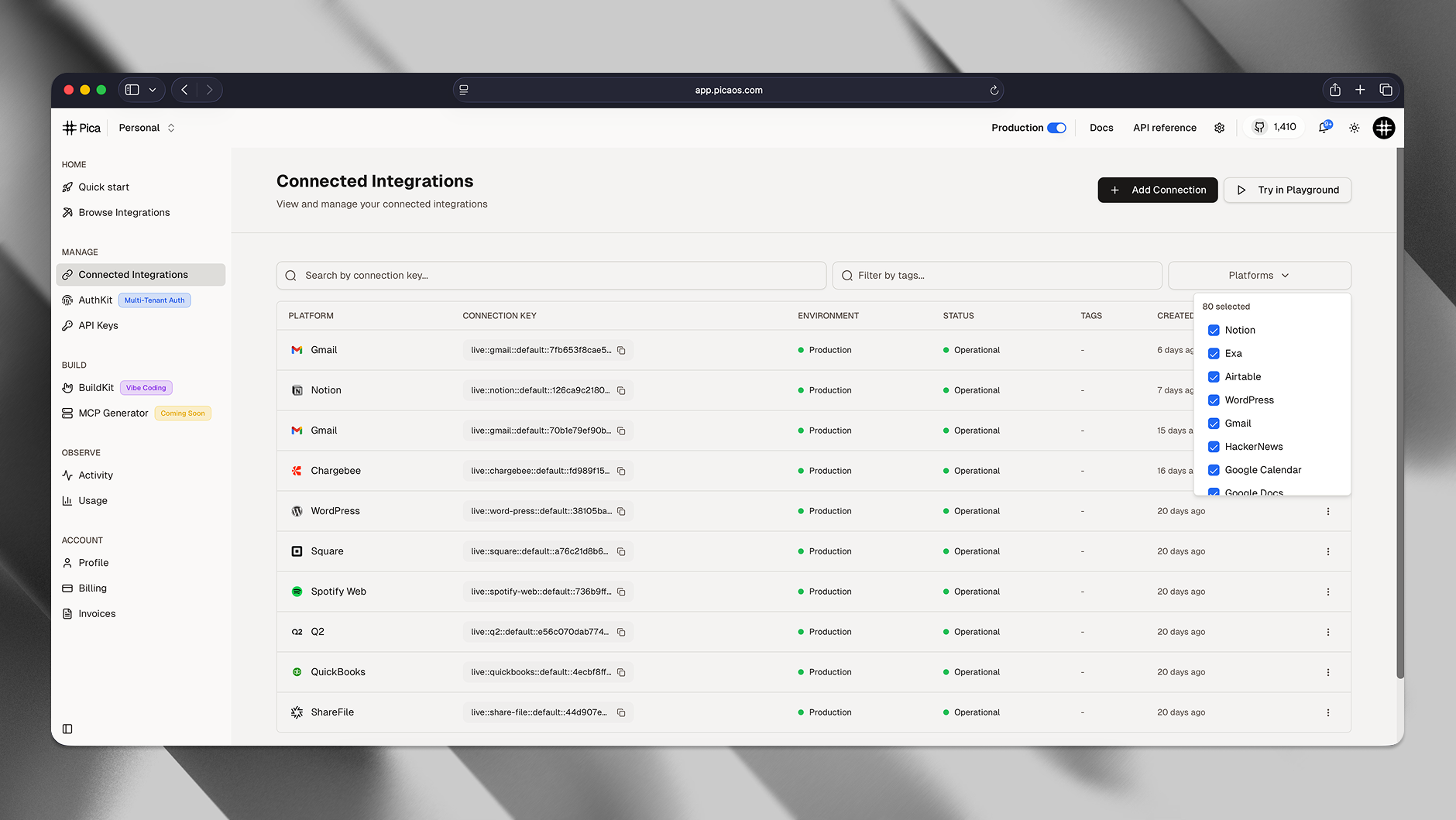 - One-Time Copyable API Keys: Enhanced security for Pica API Keys with one-time copy functionality. After creation, API keys are displayed only once.