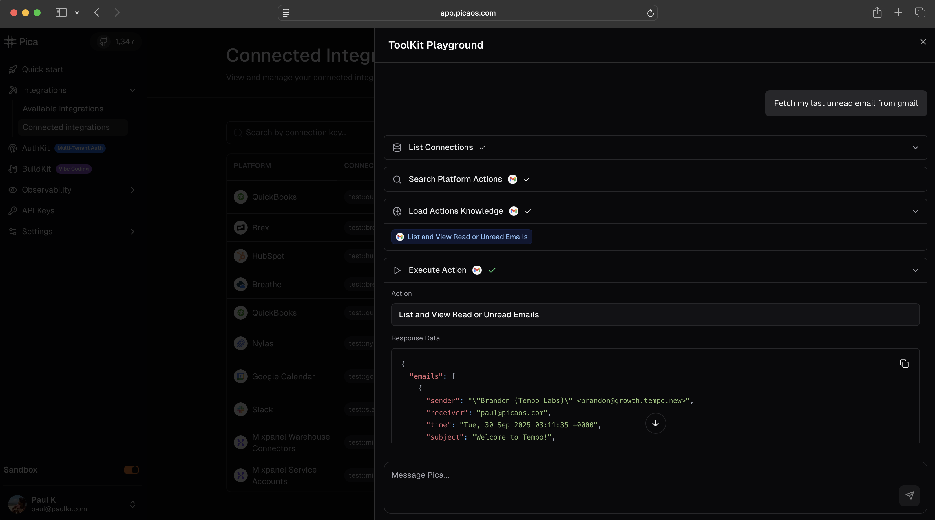 Test ToolKit with your connected integrations in the Playground